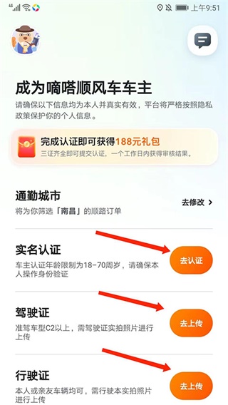 4. 按照提示依次完成实名认证,并上传驾驶证、行驶证等资料,提交审核。
