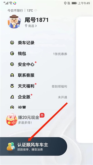 2. 在用户中心页面,点击“认证顺风车车主”选项。