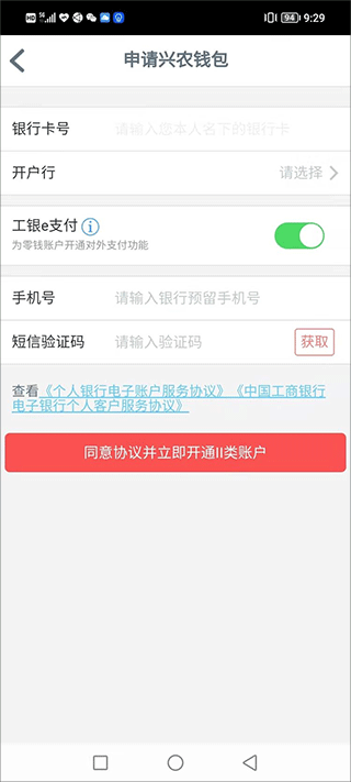 - 输入本人名下的一类银行卡号及相关信息,获取并填写短信验证码,勾选“同意协议并立即开通二类账户”。