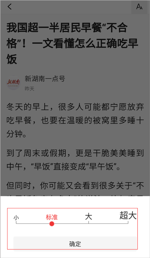 为照顾不同用户的阅读习惯,特别是中老年群体,今日早知道支持灵活的字体调整功能。只需打开任意一篇新闻,在页面右上角点击【AA】按钮,即可在【小】、【标准】、【大】、【特大】四种字号间自由切换。确认后,全文将立即以新字号显示,让阅读更清晰、更轻松。