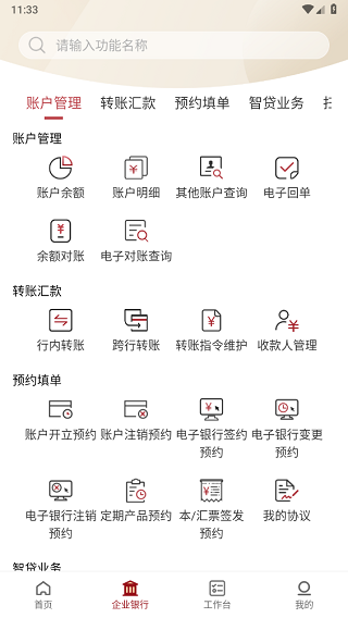 3、在“企业银行”主界面,所有功能按账户管理、转账汇款、预约清单等分类清晰呈现,操作路径直观易用。