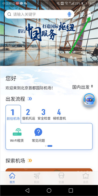 为满足中外旅客需求,App提供中英文双语界面。只需在首页右上角点击【CN/EN】标识(如下图绿色箭头所指区域),即可一键切换语言,操作便捷,体验流畅。