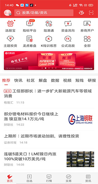 2、首页集成选股宝、指标平台、陆港通、资金流向、主题投资、龙虎看盘、K线训练营等核心模块;