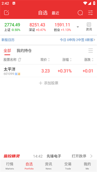 3、在【自选】界面,点击“+”号自由添加关注股票,打造专属投资观察池。