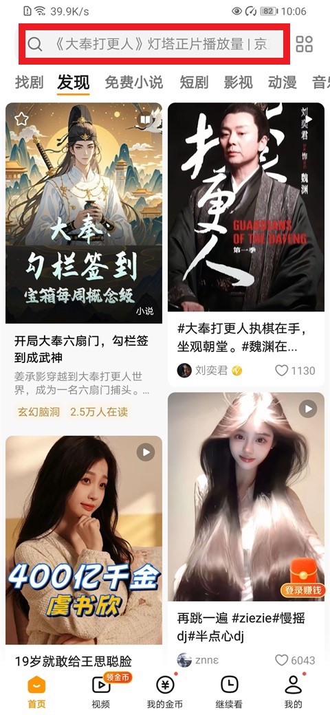 2、在搜索框中输入你想观看的影视剧名称(例如“大奉打更人”),系统将智能匹配全网资源。