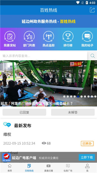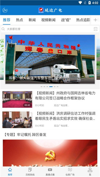 1、下载进入延边广电APP,首页即呈现最新热点新闻与重要公告;