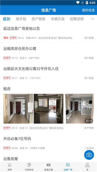 6、进入“信息广场”,获取房屋租售、招聘求职、二手交易等本地生活信息;
