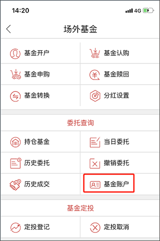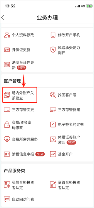 第二步:建立场内外账户关联。进入首页【业务办理】或【我的】-【业务办理】,点击【场内外关系建立】完成绑定。