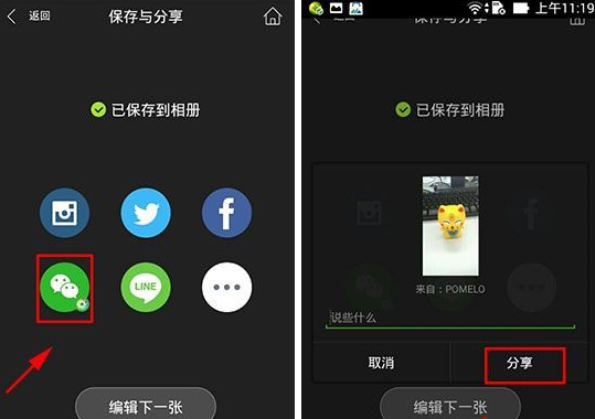 2)完成编辑后点击保存,界面上会出现微信图标按钮,点击该按钮并选择【分享】即可成功发送至朋友圈。