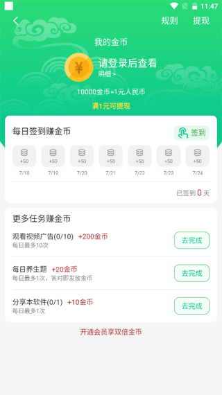 为鼓励用户持续参与健康打卡与学习,养生通引入金币奖励体系。用户可通过每日签到及完成任务获取金币,积累满10000金币即可兑换1元人民币。金币永久有效,提现支持支付宝或银行卡,到账时间为1-3个工作日。平台会根据运营情况动态调整任务奖励及金币获取渠道,但断签后暂不支持补签,建议坚持每日登录以最大化收益。