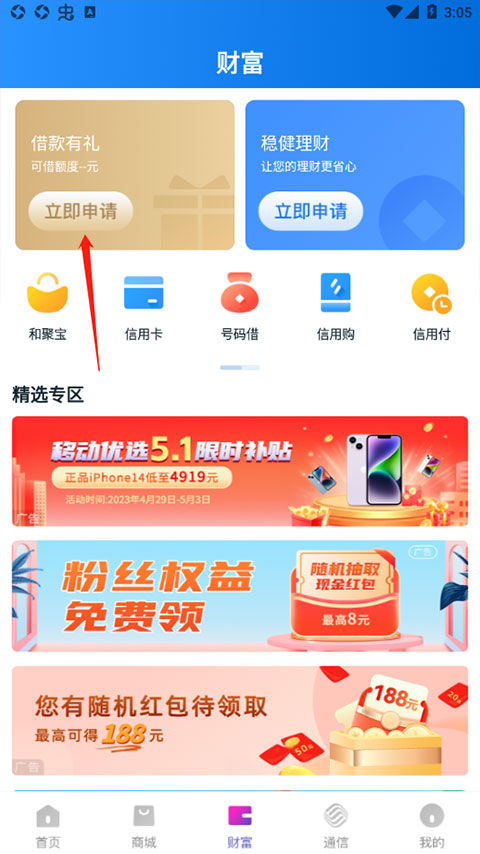 1. 打开和包借钱App,进入首页后点击“财富”入口。