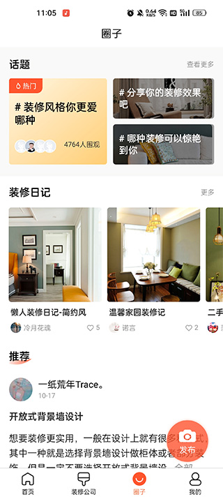 5、进入“圈子”社区,发布装修疑问、晒出自家进度或分享心得,与百万屋主互动交流。