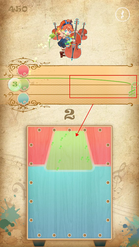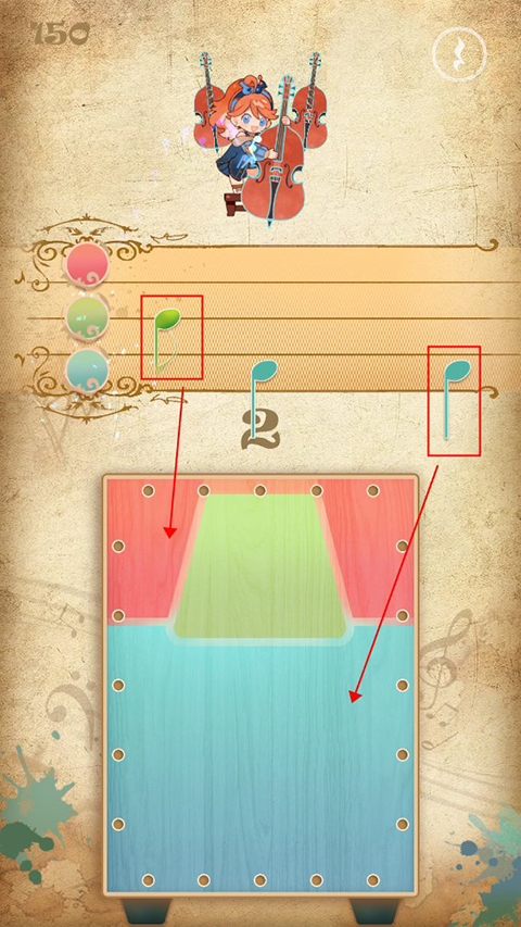 4、游戏玩法以三色演奏为主,上方会出现音符,玩家需要点击下方对应颜色收集音符,也可以根据鼓声节奏来击鼓。