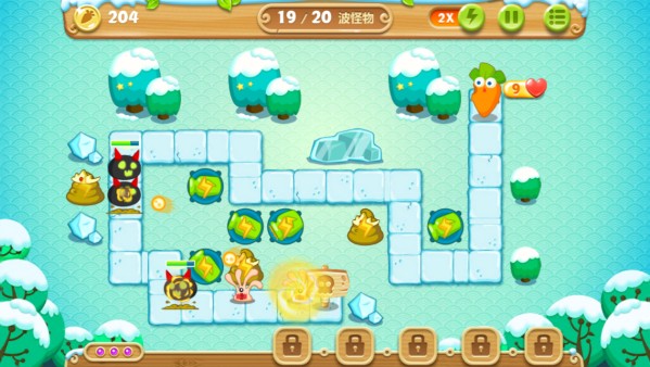 不同炮塔功能各异:范围型适合火力集中区,减速型应部署在怪物出生点或关键节点以延缓其推进速度,高输出型则用于应对高血量敌人。合理搭配三类炮塔,形成“减速—控场—爆发”的完整防御链,才能轻松拿下金萝卜甚至钻石萝卜。