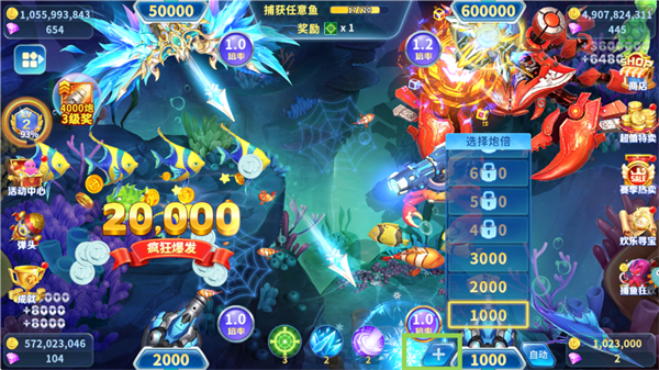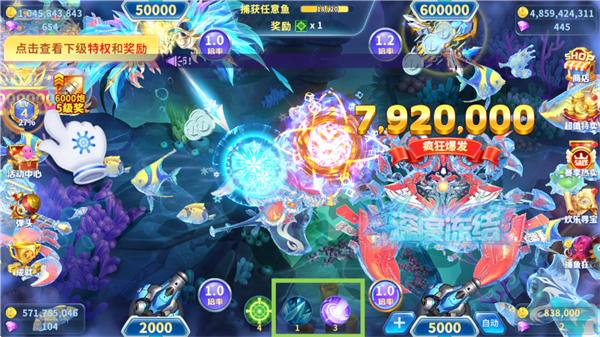 点击炮台旁“+”号切换倍率,小鱼用低倍,BOSS上高倍!