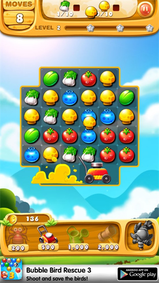 商城提供多种强力道具:Bomb可清除局部区域,旋风实现纵向贯通消除,彩虹锤则能随机匹配任意作物。针对不同关卡特性灵活选用,助你轻松化解危机。