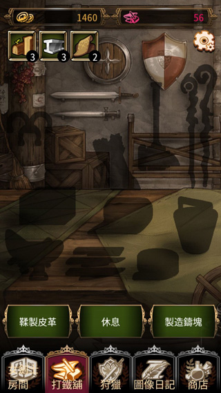 主界面简洁直观,下方设有“鞣质皮革”“休息”“制作铁块”等基础操作按钮。点击后进入迷你小游戏,只需在合适时机轻点屏幕,即可完成布偶、铁器等物品的制作。系统会根据操作精准度给出评分,高分作品更能赢得顾客满意与丰厚金币奖励。这些收入可用于商店购买强化道具,为后续狩猎与装备锻造提供坚实保障。