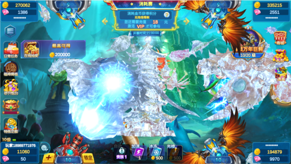 高级渔场:在高级渔场,玩家需谨慎操作。首先,确保自己拥有足够的金币储备来支持高倍炮台的使用和道具购买 。面对高分值大鱼和 BOSS 鱼,不要盲目攻击,先观察其他玩家的攻击情况,判断鱼类的剩余血量 。当大鱼血量下降到一定程度时,切换至高倍炮台,如 500 - 1000 倍,同时配合锁定道具、冰冻道具等进行攻击 。在攻击 BOSS 鱼时,要注意躲避其攻击技能,抓住 BOSS 鱼攻击间隙的短暂时间,集中火力输出 。例如,在面对机械蟹王发射激光攻击时,玩家要及时调整炮台位置,躲避激光,待机械蟹王攻击结束后,立即使用高倍炮台和道具进行反击 。