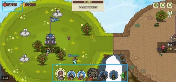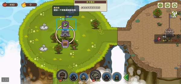 2、进入关卡后,双击城堡招募农民,优先开始采摘果树,为后续发展积累资源。