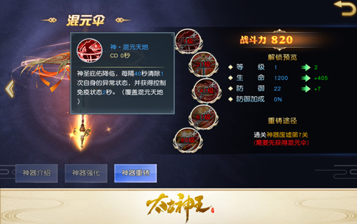 神器重铸是专为七转化神阶段玩家开放的高阶养成系统。当玩家在神器废墟中找回指定神魄后,对应神器即可晋升神阶,不仅基础属性大幅提升,全部技能效果也将同步强化。例如混元伞的1技能“混元天地”,重铸后在原有清除异常状态的基础上,新增2秒免疫控制效果,极大提升了PVP战场中的生存能力。