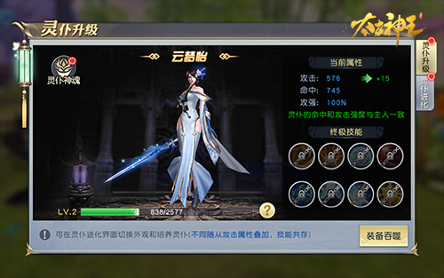 灵仆可通过吞噬紫装及以上品质装备提升等级,增强攻击、命中等属性;同时消耗“灵仆精魄”进行升阶,满阶后解锁新灵仆栏位。随着等阶提升,灵仆在战斗中的输出与辅助能力显著增强,成为你征战仙域的得力臂助。