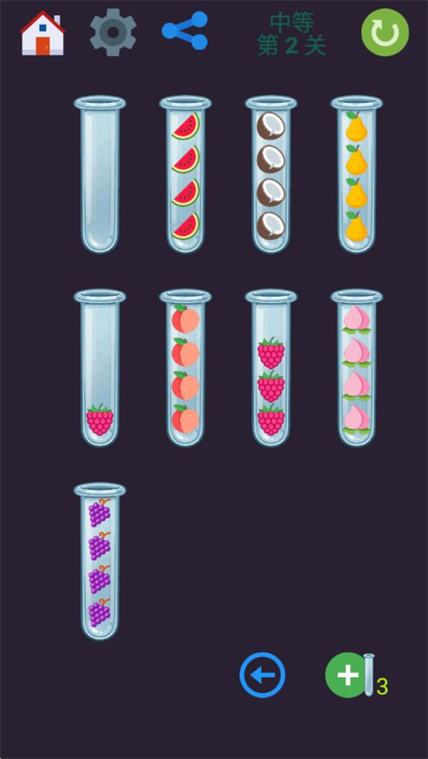 点击试管,将相同水果移动至同一试管中;当某支试管内所有水果种类一致时,即视为完成该关卡。