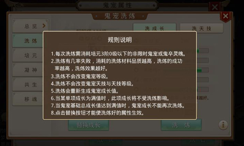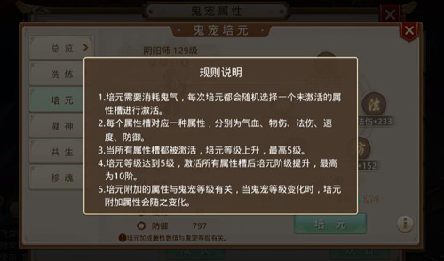 培养体系 - 洗炼:消耗鬼宠直接重置资质,建议平民优先培养高性价比鬼卒。 - 培元:消耗鬼气提升基础属性,共十阶五十级,阶数越高属性越强。 - 凝神:使用凝神草开启并强化五个属性槽,需培元达到指定阶数方可解锁。