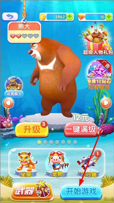 1、打开熊出没4丛林冒险最新版游戏,进入游戏页面,玩家可查看邮件、活动、兑换码、限时礼包、七日礼包等,点击开始游戏;