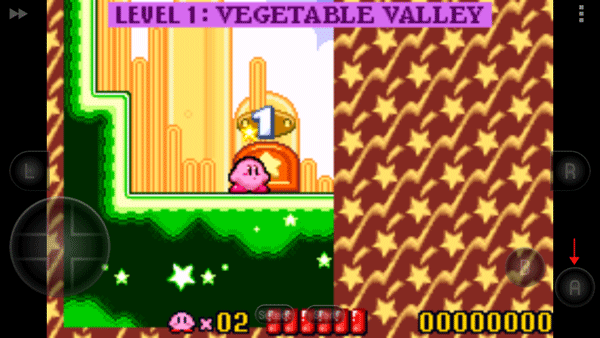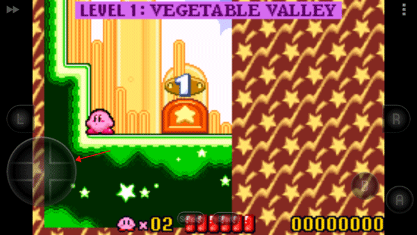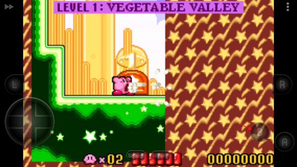 进入游戏后,点击主界面“Start”按钮即可开始冒险。关卡选择界面中,黄色图标代表已解锁关卡,灰色则需逐步通关解锁。正式游戏时,左侧虚拟方向键控制卡比移动,右侧A键用于跳跃(跳跃时会生成小星星特效),B键则执行“吸入-复制”操作——靠近敌人按下B键可将其吸入,再次按下即可吐出攻击或复制其能力。通过击败当前区域所有小怪,将触发发光传送门,进入下一场景,持续推进剧情与探索。