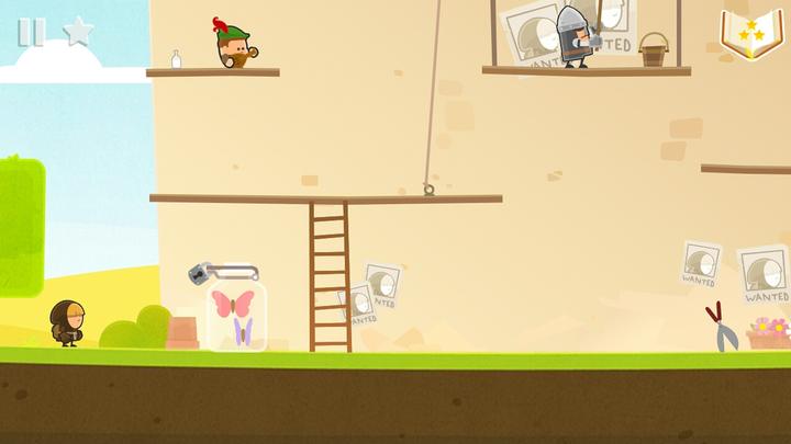 操作非常简单,点击屏幕让小小偷移动,在可被拾起的物品或可以攀爬的梯子前面时会有直观的提示按钮,点击按钮即可进行互动。