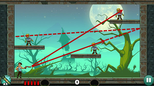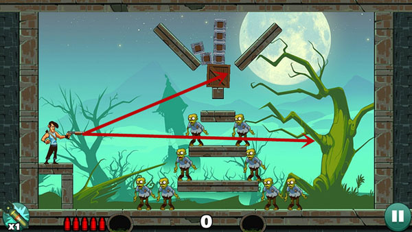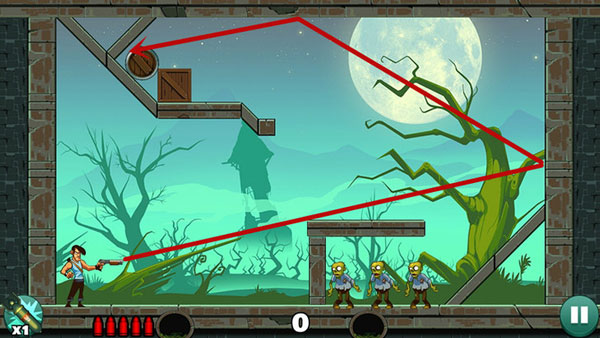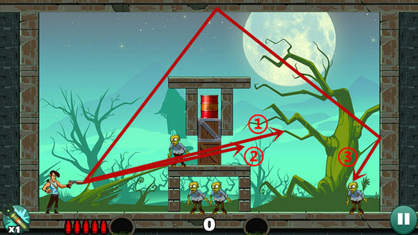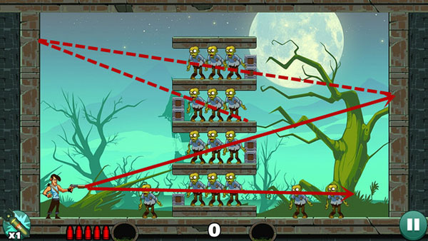 第五关:下方僵尸可平射解决;上方僵尸需借助墙面反弹,多试几次找准最佳入射角。