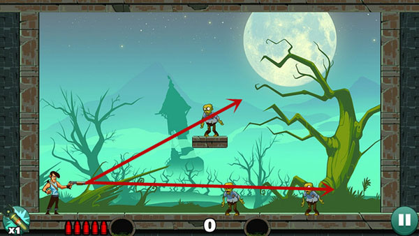 第一关:直接瞄准僵尸射击即可通关。若追求一发清场,可尝试不同角度微调。