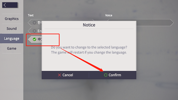3、从语言列表中选择“中文”,然后点击“Confirm”确认更改。
