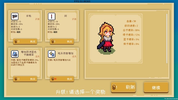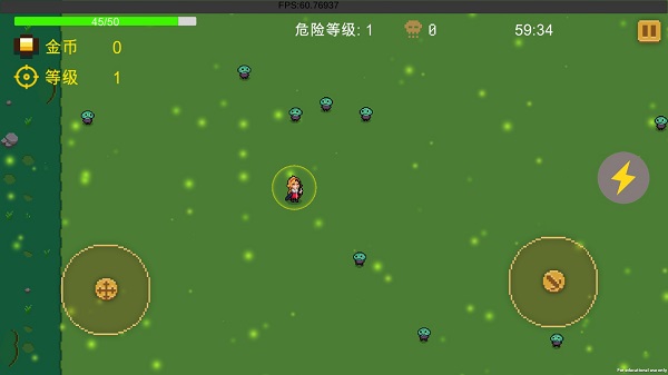 操作简洁直观:左下角虚拟摇杆控制移动,右侧按钮控制射击方向——区别于同类自动攻击机制,本作支持手动瞄准,让你精准掌控战场节奏。升级时若对当前武器或道具不满意,还可消耗金币刷新选项,灵活调整Build策略。随着游戏进程推进,你将逐步解锁更强力的装备与天赋,构筑专属的生存流派。