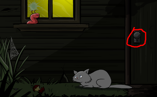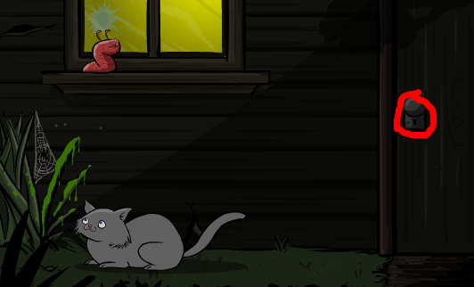 点门把,猫来,点蛛网,点烂苹果,虫吐浆,猫走,点猫,猫又来,点门上树影,进洞,点第一个钮,点第二个钮,点第三个钮,点第四个钮,点第一个钮,出来,点猫,猫死,点门把
