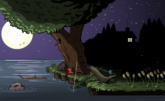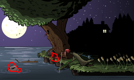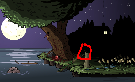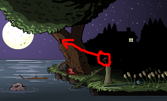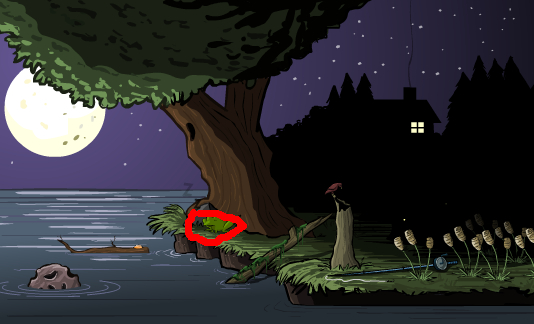 先点树枝,树枝掉下来,爬上去,点青蛙,青蛙死,点树洞,鸟飞,点鸟原来站的那木头,木头倒,点鱼竿,杆架过来,点水里石头,鱼来,点虫,虫爬杆,点几下杆